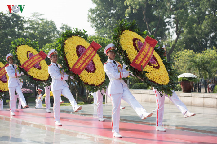 Tiếp đó, các đồng chí lãnh đạo Đảng, Nhà nước, Mặt trận Tổ quốc Việt Nam tới đặt vòng hoa, vào Lăng viếng Chủ tịch Hồ Chí Minh; thành kính bày tỏ lòng biết ơn vô hạn với công lao to lớn của Người đối với sự nghiệp cách mạng vẻ vang của Đảng và dân tộc ta.