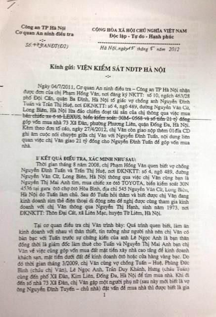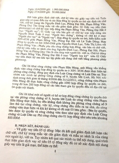 Tại Báo cáo số 479/ANĐT(Đ2) ngày 15/5/2012 của Cơ quan An ninh điều tra Công an TP.Hà Nội gửi Viện Kiểm sát nhân cùng cấp có nội dung, trong quá trình buôn bán ô tô, Nguyễn Đình Tuấn – chủ gara chợ ô tô Hòa Bình đã cấu kết với một số công chứng viên, hình thành một đường giây làm các bản công chứng giả để tiêu thụ ô tô.