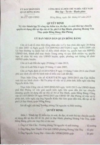 | Quyết định thành lập tổ công tác của UBND quận Hồng Bàng (Ảnh: Duy Phong) |