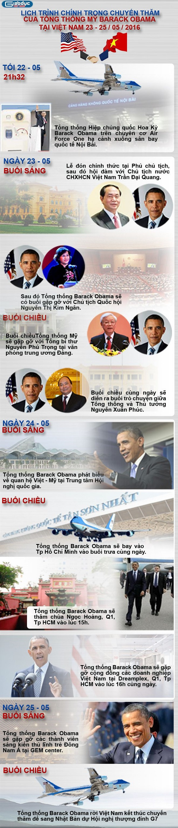 Cùng xem dự kiến lịch trình làm việc trong chuyến thăm của Tổng thống Barack Obama tại Việt Nam qua infographic dưới đây: