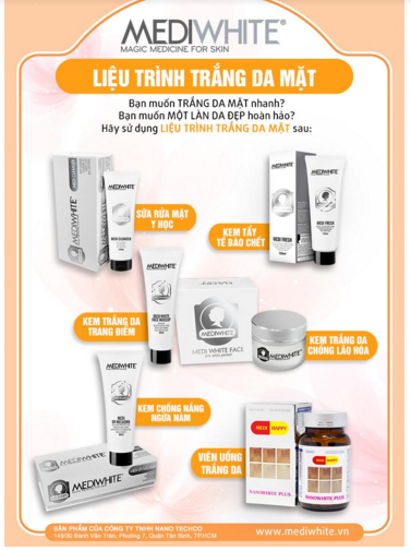 | Công Ty TNHH NanoTechco 149/30 Bành Văn Trân, Phường 7, Quận Tân Bình, TP.HCM. Website: http://mediwhite.vn/ - Email:info@mediwhite.vn Xem phản hồi khách hàng với Medi White tại: http://review.mediwhite.vn/. |