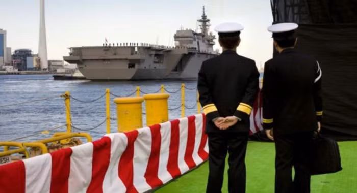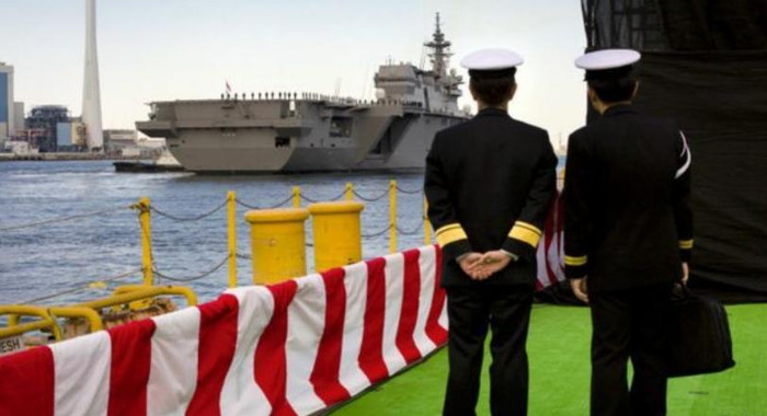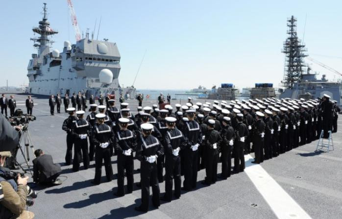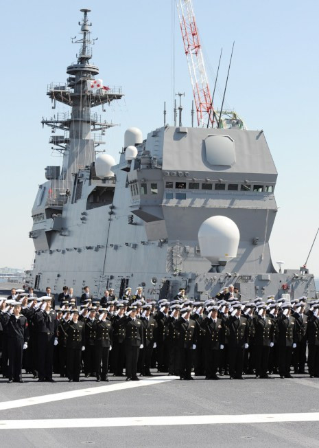 | Tàu sân bay trực thăng Izumo khi chuẩn bị bàn giao cho Lực lượng Phòng vệ Biển Nhật Bản |