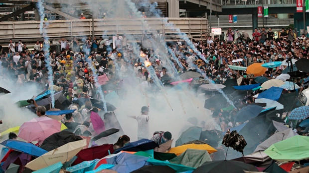 | Cảnh sát Hồng Kông dùng hơi cay, dùi cui vẫn không giải tán được đám đông người biểu tình. |