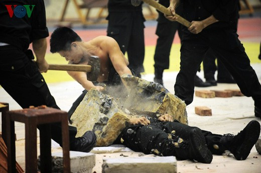 | Nữ cảnh sát cơ động kê tay lên gạch và cho búa đập trực tiếp vào tay mình được hàng trăm khán giả tại Nhà thi đấu Bộ Công an hoan hô nhiệt liệt. |