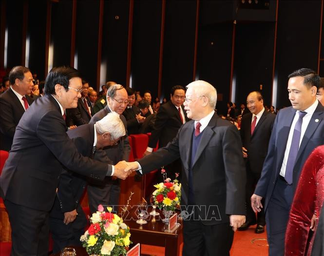 | Tổng Bí thư, Chủ tịch nước Nguyễn Phú Trọng với các đồng chí lãnh đạo, nguyên lãnh đạo Đảng, Nhà nước và các đại biểu dự Lễ kỷ niệm. Ảnh: Trí Dũng/TTXVN |