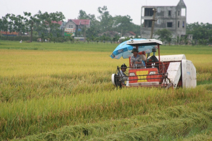 Những chiếc máy 3 trong 1: gặt - đập - cho lúa vào bao xuất hiên trên những cánh đồng của làng quê Phúc Thọ - Hà Nội
