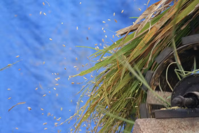 Người dân tuốt lúa ngay tại trên cánh đồng