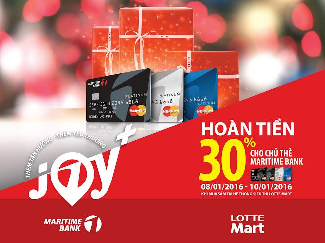 Nhằm mang lại lợi ích tối đa cho khách hàng trong mùa mua sắm cuối năm, duy nhất trong 3 ngày cuối tuần từ ngày 8 - 10/1/2016, chủ thẻ tín dụng Maritime Bank sẽ được hoàn tiền lên tới 30% giá trị hóa đơn (tối đa 500.000 đồng) khi dùng thẻ mua sắm tại Hệ thống Siêu thị Lotte Mart trên toàn quốc.