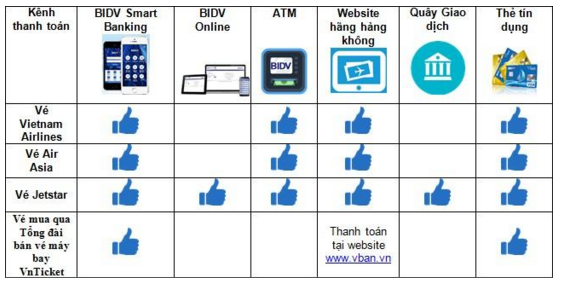 BIDV cung cấp đa dạng các kênh thanh toán phù hợp với từng nhóm khách hàng khác nhau như: thanh toán trả sau qua ATM, thanh toán trả sau tại quầy Giao dịch của BIDV, thanh toán trả sau qua Internet Banking của BIDV (BIDV Online, BIDV Smart Banking) hay thanh toán trực tiếp trên website của hãng hàng không thông qua thẻ ATM/thẻ tín dụng do BIDV phát hành. Khách hàng sẽ không mất thời gian đi lại, cũng như xếp hàng chờ đợi tại các đại lý bán vé của Hãng hàng không.