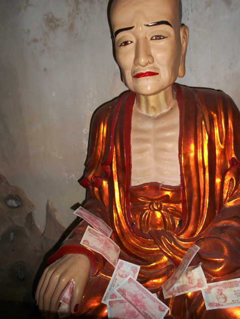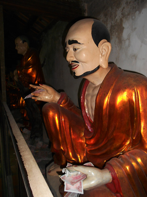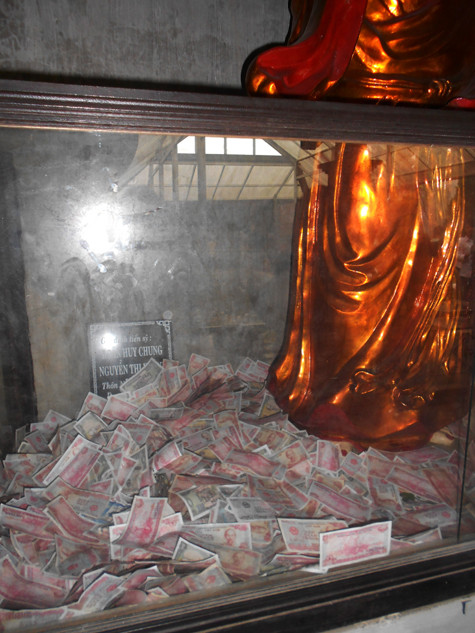 | Tiền lẻ được vứt vô tội vạ vào các khám rồng, chân tượng và nhét lên tay, lên người các vị tôn giả trong chùa. |