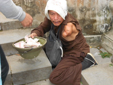 | Dọc theo lối lên chùa là đội ngũ "cái bang" đứng, nằm ngả ngớn với đủ kiểu chiêu trò để xin tiền du khách. |