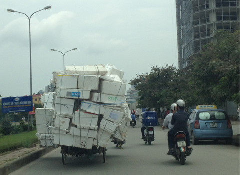 | Đi xe máy chở hàng cồng kềnh, chụp tại phố Trần Thái Tông - Cầu Giấy. Ảnh: Vũ Thị Hồng Tứ |