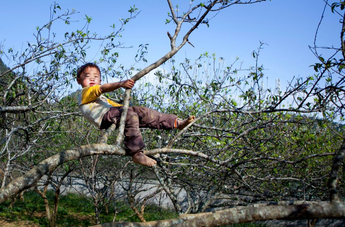 | Cậu bé người Mông đu trên cây bên cạnh chú gà trống trông thật ngộ nghĩnh |