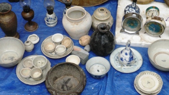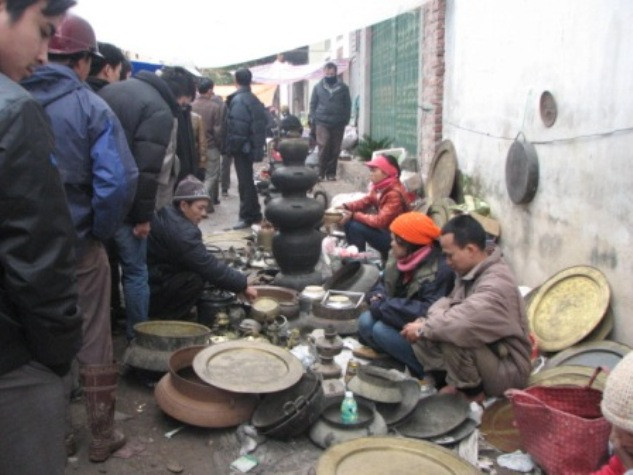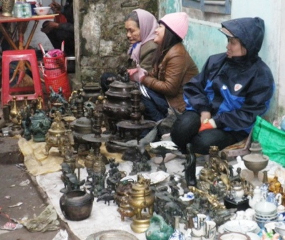 | Ngoài những cành lộc thường thấy ở chợ Viềng, huyện Vụ Bản, Nam Định thì những món đồ cổ cũng được bày bán tại đây |