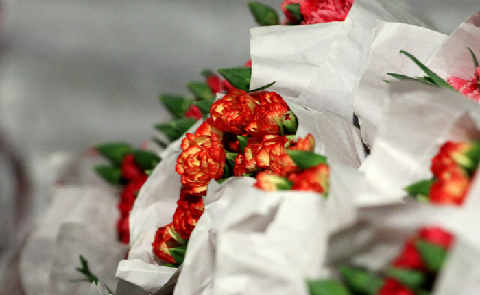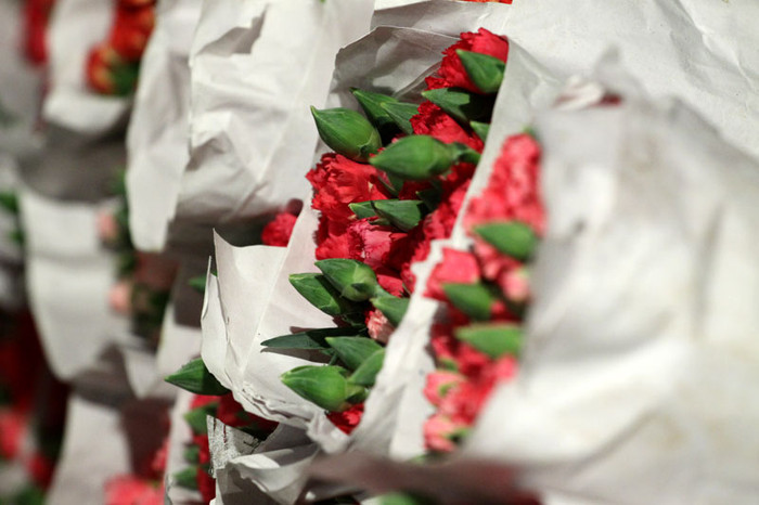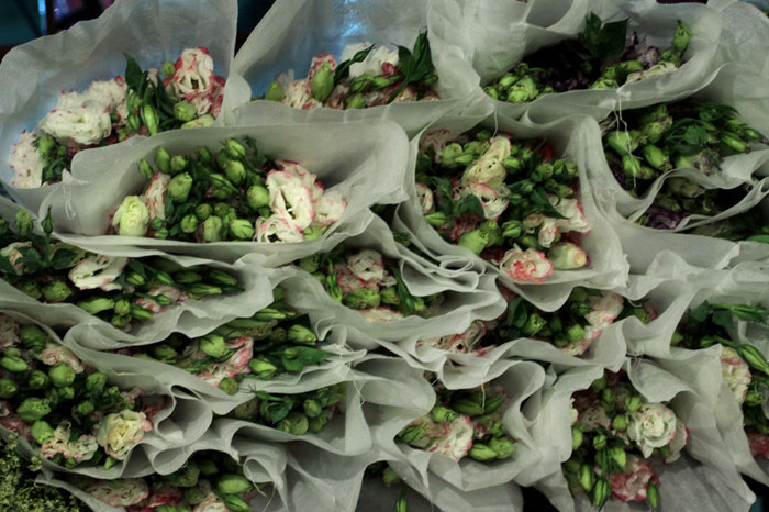 | Sắp sếp ngay ngắn những bó hoa đợi khách đến mua. |