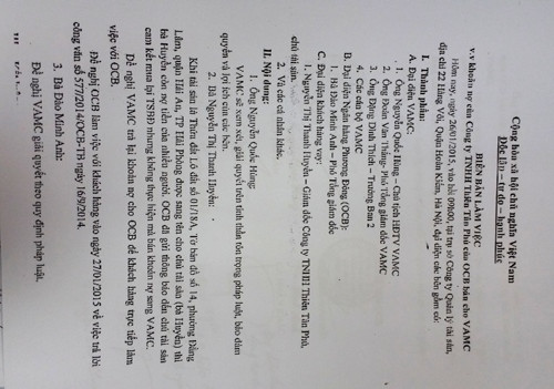 | Biên bản làm việc ngày 26/1/2015 giữa VAMC - OCB và khách hàng. Trong biên bản này, VAMC đưa ra tối hậu thư cho OCB là: "Trong thời gian 7 ngày, OCB phải làm việc với khách hàng để giải quyết vụ việc. Nếu hết thời hạn trên, OCB không làm việc với khách hàng để giải quyết, VAMC sẽ trả lại khoản nợ của Công ty TNHH Thiên Tân Phú cho OCB". Ảnh: Duy Phong |