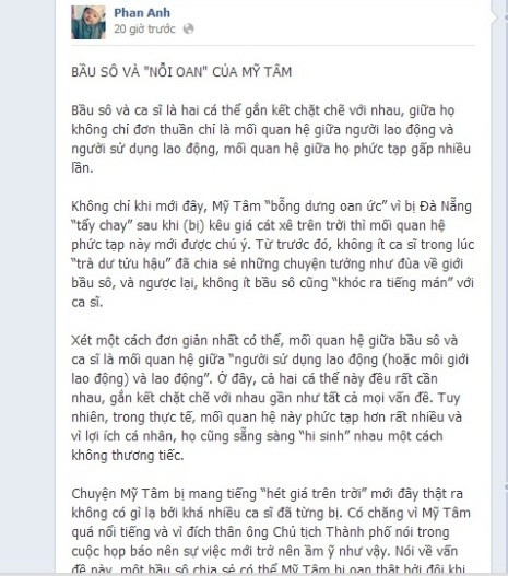Phóng viên một tờ báo mạng vốn gắn bó nhiều năm với showbiz cũng bày tỏ trên trang cá nhân của mình. Anh viết một chia sẻ khá dài về vấn đề bầu show, ca sĩ và cát-sê, trong đó có đoạn: “Trở lại với chuyện Mỹ Tâm, cô vừa đưa ra thông báo chính thức về scandal “hét giá trên trời” này. Cho dù sau sự việc này, Mỹ Tâm có được “minh oan” hay công ty Sơn Lâm (đơn vị đã đưa giá mời Mỹ Tâm cho UBND TP.Đà Nẵng) có “phản hồi” lại thì sự việc vẫn đã diễn ra và uy tín của Mỹ Tâm chắc chắn sẽ bị ảnh hưởng. Nhưng qua sự việc này mới thấy, đằng sau những ánh hào quang của showbiz, là một “trận chiến” thực sự khi mà người này sẵn sàng “hi sinh” người kia vì lợi ích cá nhân của mình”.