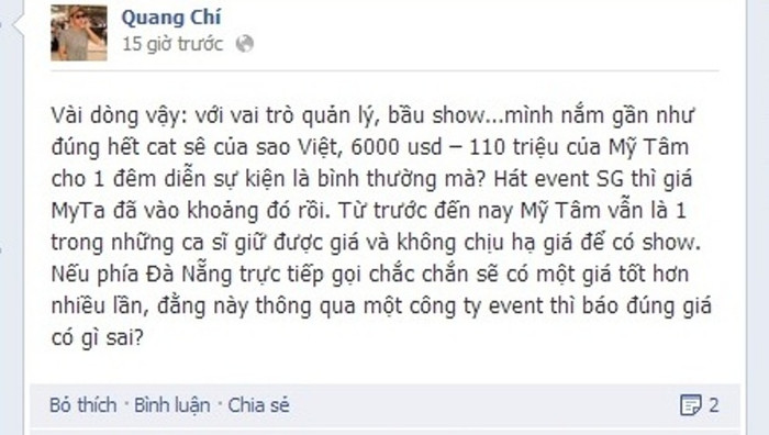 Trên trang cá nhân của Quang Chí, người khá đa năng với vai trò quản lý, bầu show tại TP.HCM, có status như sau: “Mình nắm gần như đúng hết cát-sê của sao Việt, 6000USD - 110 triệu của Mỹ Tâm cho một đêm diễn sự kiện là bình thường mà. Hát event ở Sài Gòn thì giá Mỹ Tâm đã vào khoảng đó rồi. Từ trước đến nay Mỹ Tâm vẫn là một trong những ca sĩ giữ được giá và không chịu hạ giá để có show. Nếu phía Đà Nẵng trực tiếp gọi chắc chắn sẽ có một giá tốt hơn nhiều lần, đằng này thông qua một công ty event thì báo đúng giá có gì sai?”.