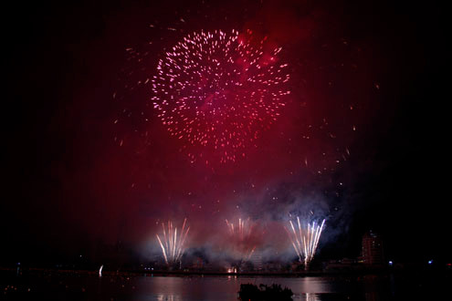 | Sông Hàn lung linh bởi những màn pháo hoa, khi đỏ rực... |
