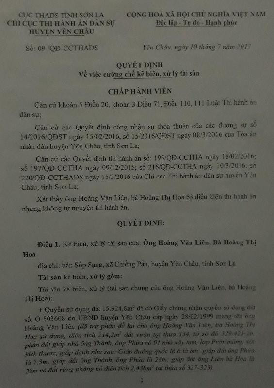 Ngày 10/07/2017, Chi cục Thi hành án dân sự huyện Yên Châu liên tiếp ban hành 02 quyết định số 09/QĐ-THADS về việc cưỡng chế kê biên xử lý tài sản và quyết định số 28/TB-THADS về việc cưỡng chế thi hành án đối với gia đình ông Hoàng Văn Liên và bà Hoàng Thị Hoa với kinh phí dự trù cho buổi cưỡng chế là 113.100.000 đồng do chấp hành viên Lừ Văn Tâm ký.