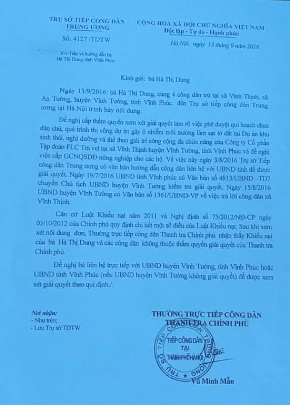 Công văn nêu: "Ngày 13/09/2016, bà Hà Thị Dung cùng 4 công dân trú tại xã Vĩnh Thịnh, xã An Tường, huyện Vĩnh Tường, tỉnh Vĩnh Phúc đến trụ sở tiếp công dân Trung ương tại Hà Nội trình bày nội dung: