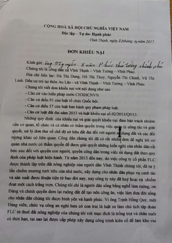 Liên quan đến siêu dự án của FLC “nuốt” trọn đất nông nghiệp, hàng trăm hộ dân xã Vĩnh Thịnh, huyện Vĩnh Tường (Vĩnh Phúc) đã có thư gửi đến Thủ tướng Chính phủ và các cơ quan ban ngành cầu cứu.