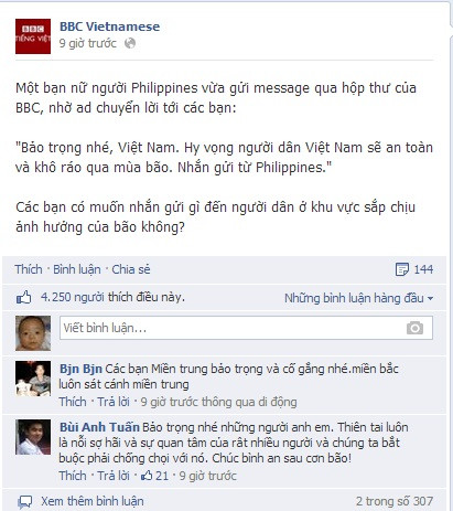 Thông điệp được BBC đăng tải như sau: "Một bạn nữ người Philippines vừa gửi message qua hộp thư của BBC, nhờ ad chuyển lời tới các bạn: "Bảo trọng nhé, Việt Nam. Hy vọng người dân Việt Nam sẽ an toàn và khô ráo qua mùa bão. Nhắn gửi từ Philippines."".