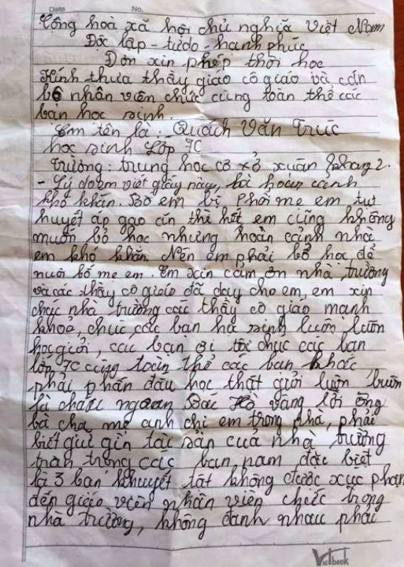Ngày 10/06/2016, cô Nguyễn Thị Khuyên - Giáo chủ nhiệm của học sinh Quách Văn Trúc (học sinh có đơn xin thôi học hiện đang học tại lớp 7C, trường THCS xã Xuân Khang) cho biết, nội dung một lá đơn xin thôi học của Trúc đã khiến toàn bộ giáo viên, học sinh xúc động, bật khóc.