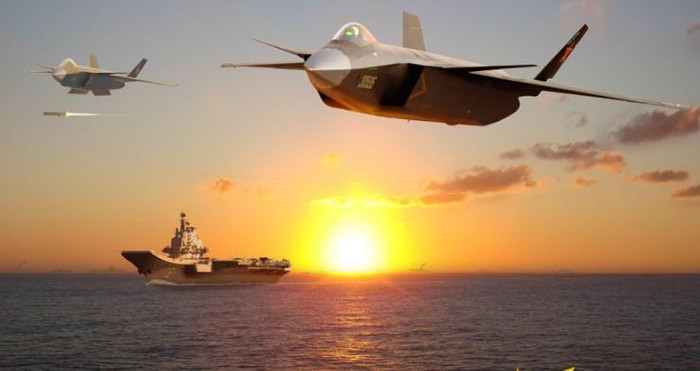 | Máy bay chiến đấu J-20 hộ tống cho tàu sân bay Liêu Ninh (dân mạng Trung Quốc tưởng tượng) |