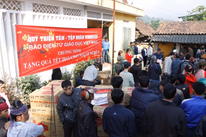 | Phó TBT Báo Giáo dục Việt Nam Bùi Ngọc Cải (áo xanh) và ông Phạm Nguyễn Toan,Phó trưởng Ban Truyền thông tập đoàn Vingroup trao quà tết cho bà con Tây Bắc. |