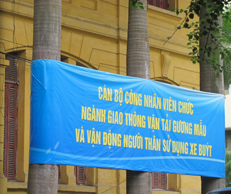 Mặc dù chỉ đứng ngoài trụ sở Bộ GTVT nhưng chúng tôi cũng cảm nhận được một không khí quyết tâm mà Bộ trưởng đã truyền tới đây khi bắt đầu ngồi “ghế nóng”. Ngay trước cổng, một tấm băng rôn to màu xanh bắt mắt được treo ngay trên cây với khẩu hiệu kêu gọi cán bộ nhân viên ngành GTVT sử dụng xe buýt.