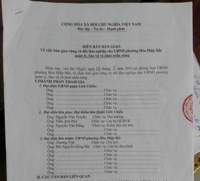 Để chứng minh, ông Hải cung cấp cho phóng viên Biên bản bàn giao rừng và đất lâm nghiệp cho UBND phường Hòa Hiệp Bắc quản lý, bảo vệ và phát triển rừng.