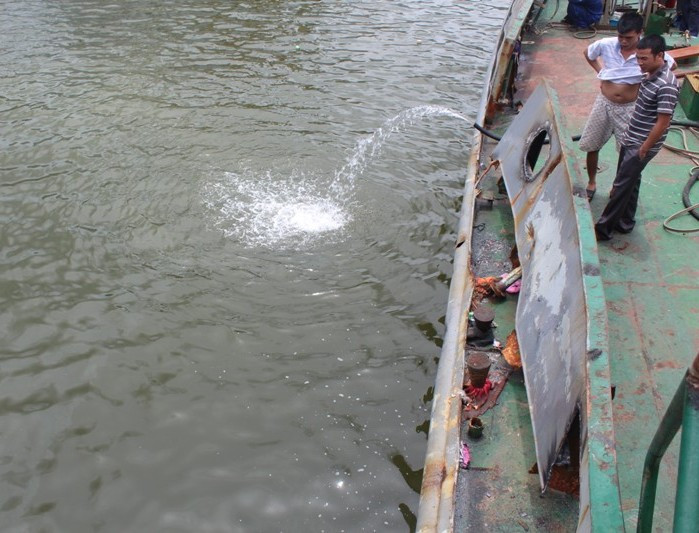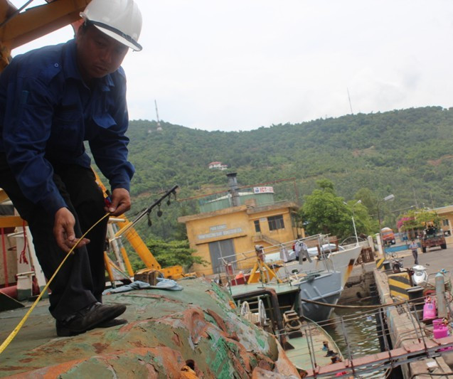 | Sau khi cập cảng Đà Nẵng gần một ngày, ngày 29/6, các công nhân đang tiến hành sửa chữa lại tàu kiểm ngư KN 951 bị hư hỏng nặng sau khi thực hiện nhiệm vụ chấp pháp trên vùng biển Hoàng Sa của Việt Nam bị nhiều tàu Trung Quốc đâm vào sáng ngày 23/6 vừa qua. |