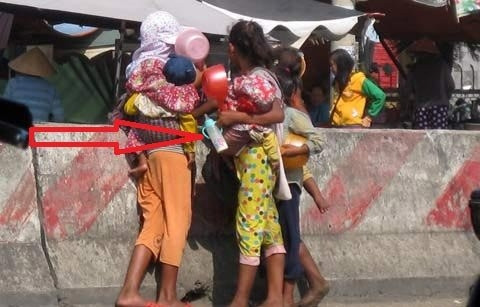 Những đứa trẻ đen nhẻm, gầy guộc dưới 10 tuổi bồng bế 2 đứa trẻ đang còn bú sữa mẹ đứng giữa trời nắng chói chang.