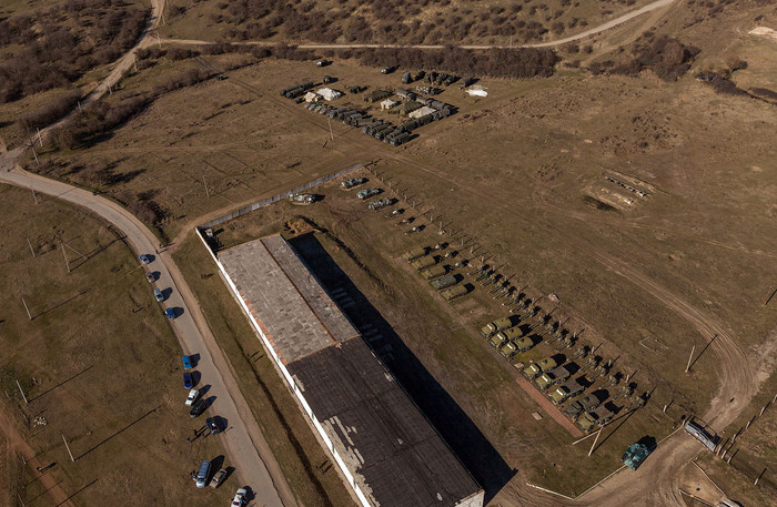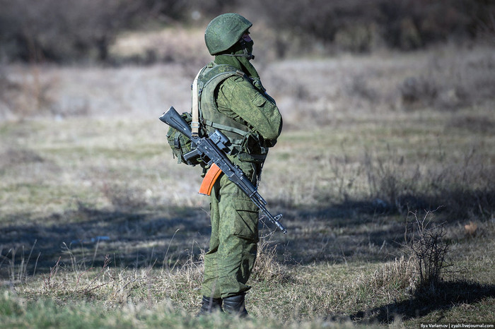 | Lính lạ chốt giữ bên ngoài một căn cứ quân sự ở Ucraine, phía trong vẫn có những binh sỹ mặc sắc phục của lực lượng quân đội nước chủ nhà (Ucraine) |