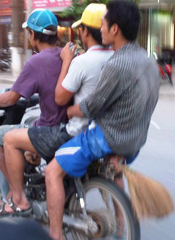 | "Trẻ em làm xiếc cùng ba": Em bé một tay giữ mũ, còn một tay bám lấy ba trên xe máy. Chụp tại thị trấn Lái Thiêu, Thuận An, Bình Dương. Ảnh: Trịnh Văn Hải. |