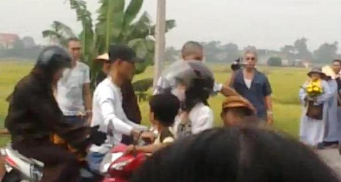 | Khi hết giờ hành lễ buổi sáng, những người trong đoàn tháp tùng nhanh chóng đưa nhà sư lên 1 xe máy |