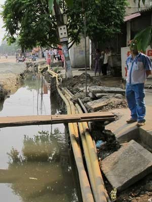 | Thi công đào đường lên rồi bỏ mặc khiến đường thành "sông". |
