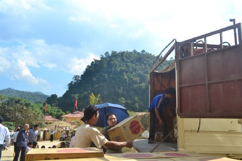 | Người dân hỗ trợ bốc dỡ hàng từ xe tải. |