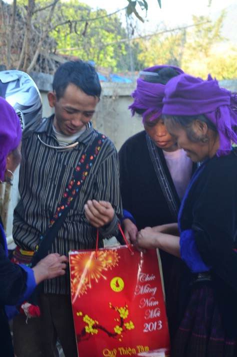 | Niềm vui của người dân khi nhận được lịch treo tường năm mới, phong bì tiền và bánh kẹo. |