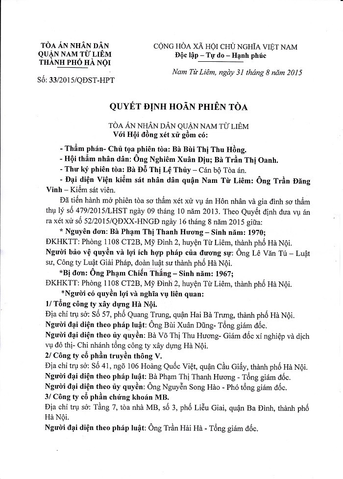 | Phiên tòa được tạm hoãn bởi Quyết định hoãn phiên tòa số 33/2015/QĐST-HPT ngày 31/8/2015. |