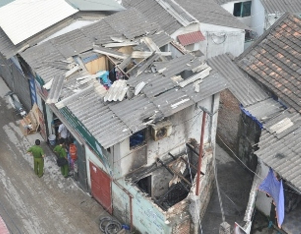 Tuy nhiên, vụ nổ này đã khiến mái tôn rộng cả chục mét vuông của cửa hàng gas bị hất tung, nhiều đồ đạc trong cửa hàng bị thiêu rụi, 3 bình ga bị cháy đen và biến dạng.
