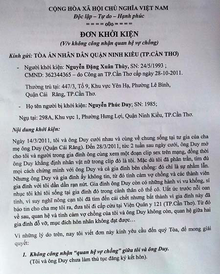 | Đơn kiện của Xuân Thùy gửi TAND quận Ninh Kiều |