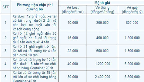 Khi lưu thông qua các trạm thu phí này, lái xe phải nộp các loại phí từ 10 - 80 nghìn đồng/lượt, tương đương với mức nộp 3,6 triệu đồng đến 28,8 triệu đồng/năm. Mức thu thấp nhất 10 nghìn đồng/lượt áp dụng với xe dưới 12 ghế ngồi, xe tải có tải trọng dưới 2 tấn và các loại xe buýt vận tải khách công cộng. Mức thu theo tháng cố định là 300 nghìn đồng/tháng, tương đương với 3,6 triệu đồng/năm; thu theo quý 800 nghìn đồng/quý, tương đương 3,2 triệu đồng/năm.