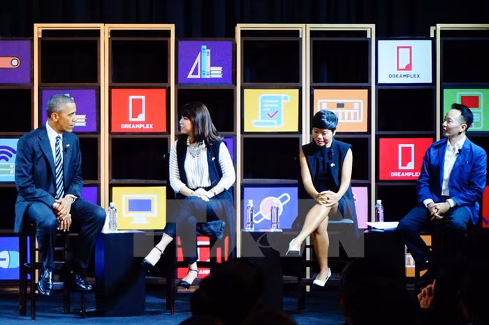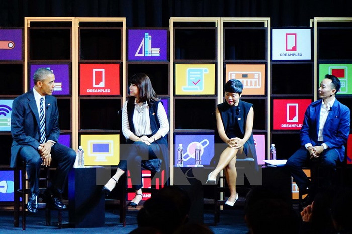 Sau đây là hình ảnh Tổng thống Obama tham quan và gặp gỡ với các doanh nghiệp trẻ khởi nghiệp tiêu biểu tại Không gian sáng tạo Dreamplex thuộc tòa nhà Miss Áo Dài.