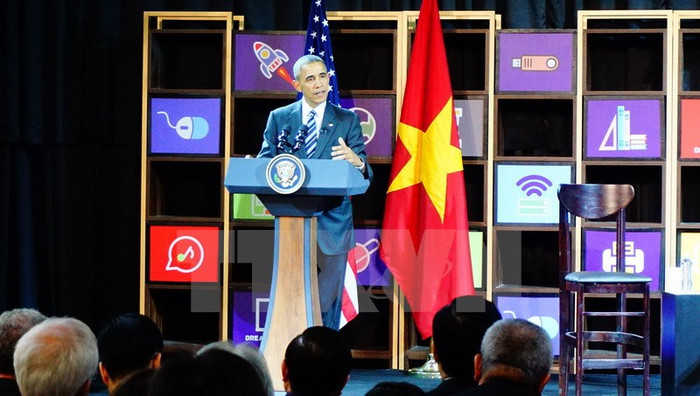 | Tổng thống Mỹ Obama tới tòa nhà Miss Áo Dài, đường Nguyễn Trung Ngạn, quận 1, Thành phố Hồ Chí Minh. |