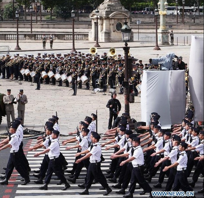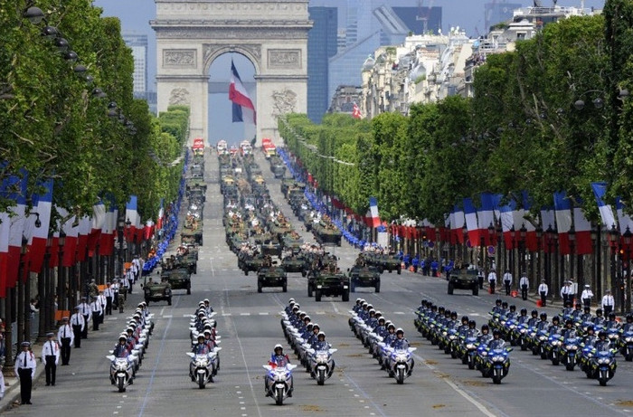 | Binh sỹ Pháp diễu binh trên đại lộ Champs-Elysees. |