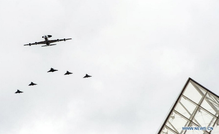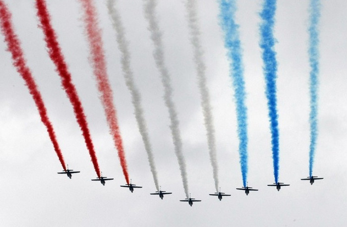 | Đội bay của Không quân Pháp thể hiện sức mạnh trên bầu trời. |