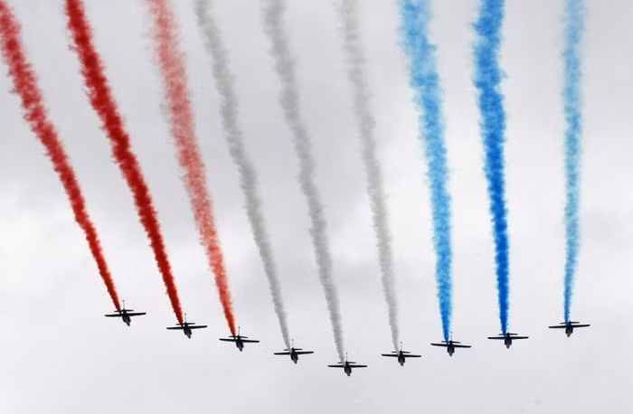 | Phi đội Patrouille de France nhả khói rực rỡ trên bầu trời Paris. |