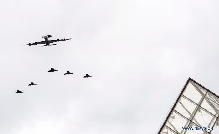 | Hình ảnh chụp từ chiếc máy bay Boeing C135, cho thấy 2 máy bay chiến đấu Rafale và 2 máy bay chiến đấu Mirage đang bay qua bầu trời Paris. |